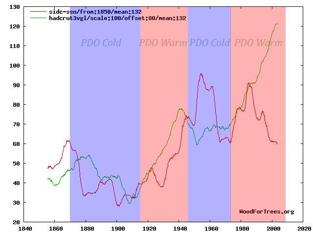 As you can see, the blue band, supposedly sans mankind, shows a steadily declining temperature. This never made much sense to me, given that, almost however you measure it, solar activity over the last half of the decade was stronger than the first half, but they show the natural forcings to be exactly opposite from what we might expect from this chart of solar activity as measured by sunspots (red is smoothed sunspot numbers, green is Hadley CRUT3 temperature).